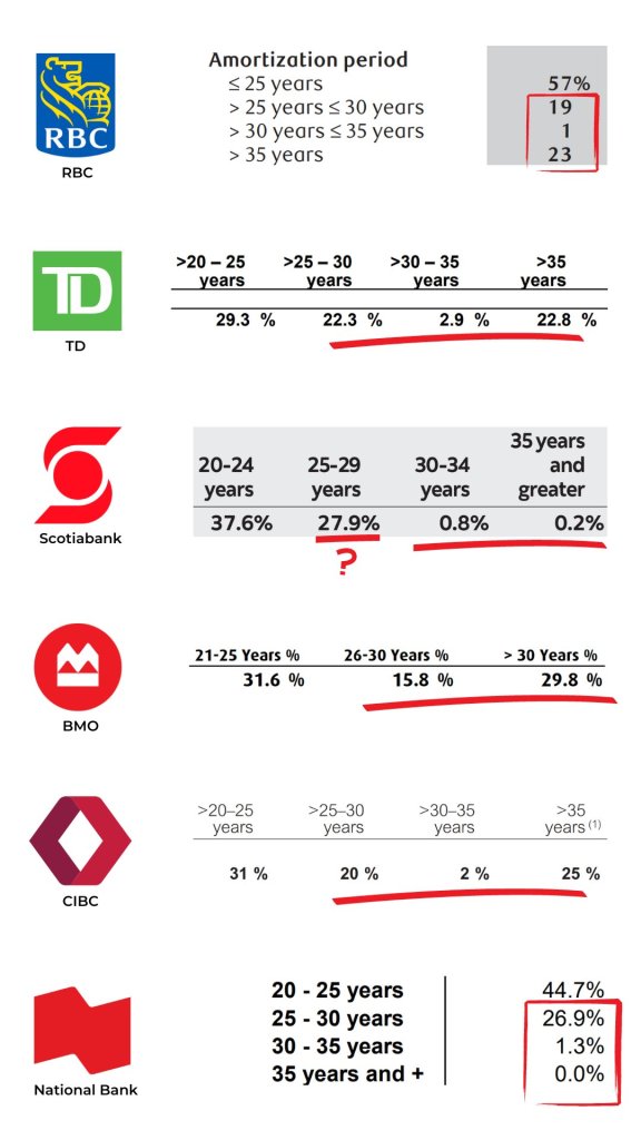Look at those numbers!!! TD, RBC, BMO, and CIBC seem to have an amortization problem. I am particularly worried on the percentage of borrowers over 35 years. This will be life altering for a good chunk of society. When you take the amortization from 20 years to over 35 years, it means you have an additional 15+ years of mortgage payments. Now, the issue with that is that the money that will now be going to a mortgage for those extra 15 years cannot go to your child’s education, RRSP’s, retirement, TFSA’s etc. This means we will see aftershocks of this last 2 years of rate increases for potentially 50+ years into the future.